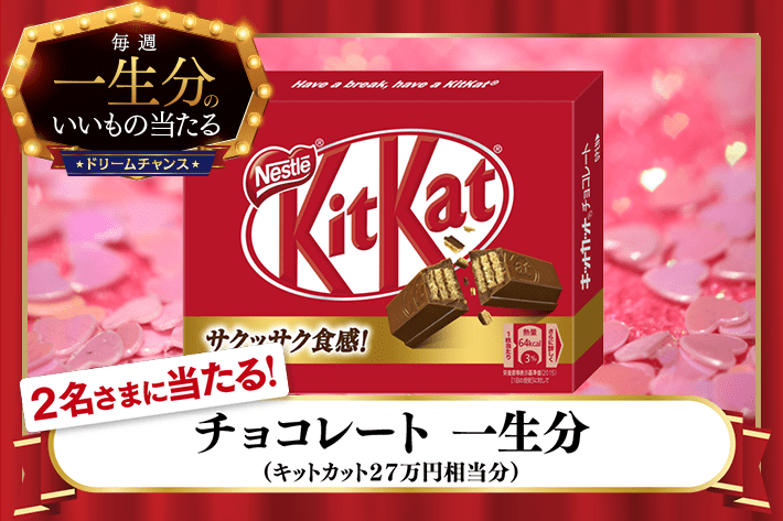 キットカットミニ3枚入り30箱を現物、残りJCBギフトカードを抽選で2名様にプレゼントいたします。
