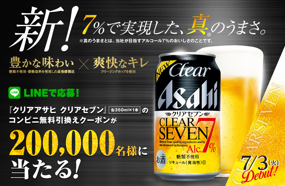 『クリアアサヒ クリアセブン』コンビニ無料引換えクーポンを抽選で200,000名様にプレゼントいたします。